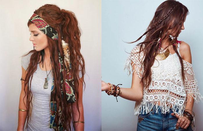 Присутствие аксессуаров поддержит общий стиль. В качестве украшений используют ленты, ободки, платки. Желательно присутствие этнических мотивов, звериных орнаментов, бахромы.