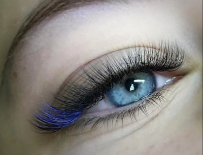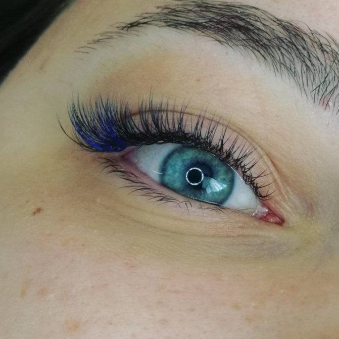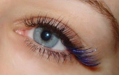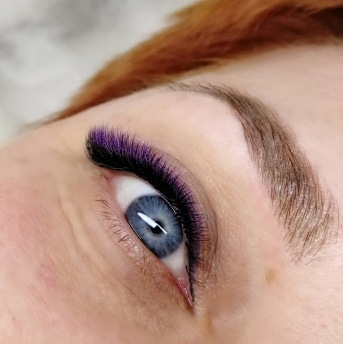 - Часто используются для наращения ресницы с фиолетовыми уголками. Они становятся заметней при определённом освещении. Если в помещении недостаточно ярко, то цветные волокна не будут сильно отличаться от остального ресничного ряда.
