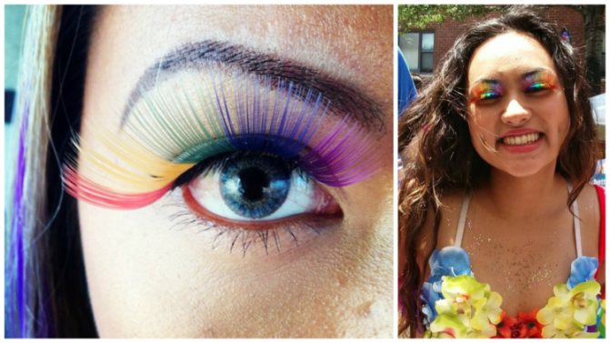 Суть состоит в применении разноцветных ворсинок на кончиках ресниц, которые контрастируют с черным основанием.