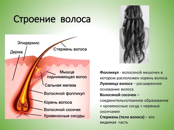 Волосы человека имеют одинаковое строение. Они представляют собой волосяной фолликул (луковица), который спрятан в корневом влагалище, и стержень самого волоса.