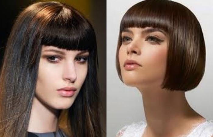 Прямую челку легко узнать по срезу параллельному границе роста волос у лба. Может повторять идеально ровную линию или включать градуировку кончиков. Объем распределяется равномерно по всей длине, имеет правильную графичную форму. Вариации позволяют использовать 3 длины — выше уровня бровей, модель, достигающая бровных дуг, а также удлиненный вариант. Последний позволяет скрыть не только высокий лоб, но и несимметричную форму бровей.