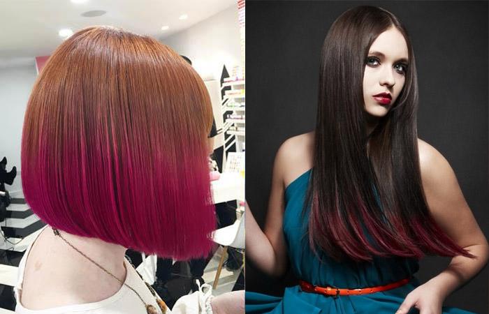 В большинстве случаев омбре предполагает контрастный переход между цветом. Кончики окрашивают в яркие или светлые цвета, а корни, как и в технике балаяж, оставляют натуральными. Можно пигментировать только кончики (примерно 10 см). Но в большинстве случаев мастера наносят краситель на локоны от линии ушей.