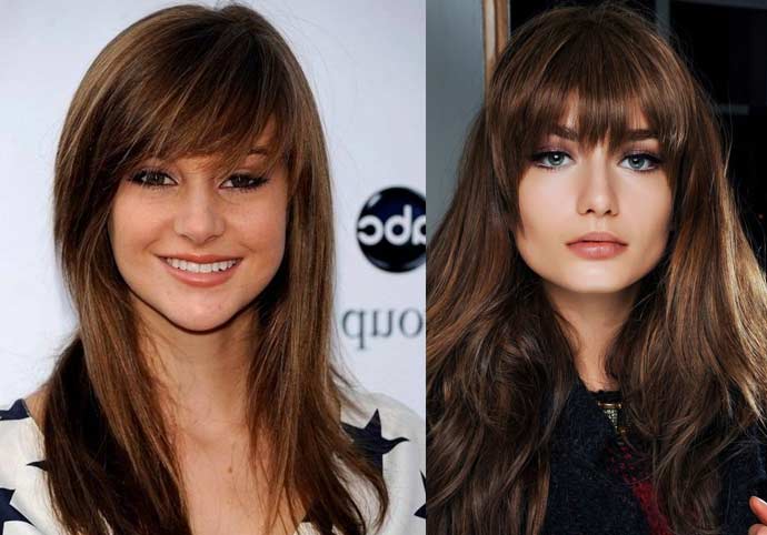 - С прямой челкой ниже бровей. Прямая длинная челка акцентирует внимание на глазах. Ну а в случае необходимости челку можно убрать при помощи заколки или воска для волос. Стрижку желательно сделать с легкой лесенкой, чтобы подчеркнуть и слегка скорректировать овал лица.