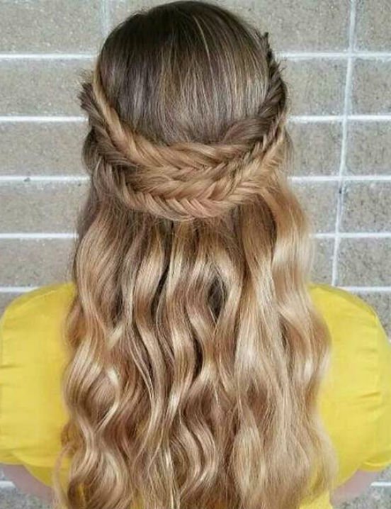 Ото лба создаем две косички рыбий хвост и завязываем их сзади полукругом, закрепляем с помощью резинки. Затем оборачиваем вокруг нее прядь волос, чтобы скрыть. Эта потрясающая прическа идеально смотрится вместе с макси платьем.