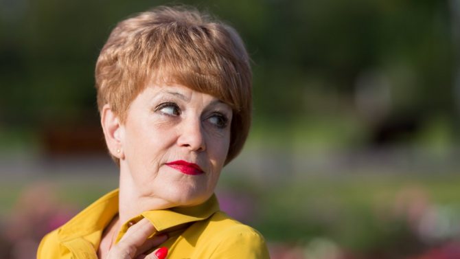Особенно некрасиво смотрятся на возрастных дамах выбритые виски. Это выглядит вызывающе и зрительно добавляет возраст. Стилисты настоятельно советуют отказаться от цветных прядей, ярких заколок, украшений для волос.