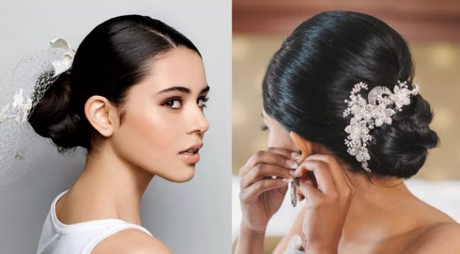 Совершенно не обязательно создавать сложную прическу на свадьбу, если душа не лежит к помпезности. От кудрявых локонов или начесов также можно отказаться. Стиль может выражаться и в простых, лаконичных вещах. Гладко причесанные волосы, собранные в пучок сзади или по бокам, дают акцент на белоснежную фату, оригинальное головное украшение или кокетливую шляпку. Более того, такая укладка позволяет окружающим и жениху сосредоточиться на красоте лица невесты, полюбоваться на ее открытую шею. Именно такой стиль принято называть благородным, изящным.
